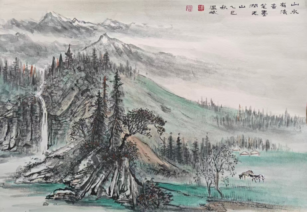在《生态乡村入天山》《满眼芳草绿一路杏花香》等作品中,温斌展现了生态意识与传统山水精神的交融。他笔下的天山并非遥不可及的圣山,而是与人类生活和谐共存的生态空间。这种处理方式既承接了宋代山水“可居可游”的美学理想,又注入了当代的生态关怀。值得注意的是,温斌并未采用西方风景画的写实手法,而是运用传统山水画的散点透视与意境营造,创造出一种既真实又超越的边疆景观。这种创作方法表明,他并非简单地用国画技法描绘新疆风景,而是在进行一种语言转换——将边疆经验转化为山水画的美学词汇。