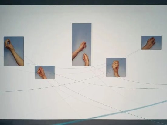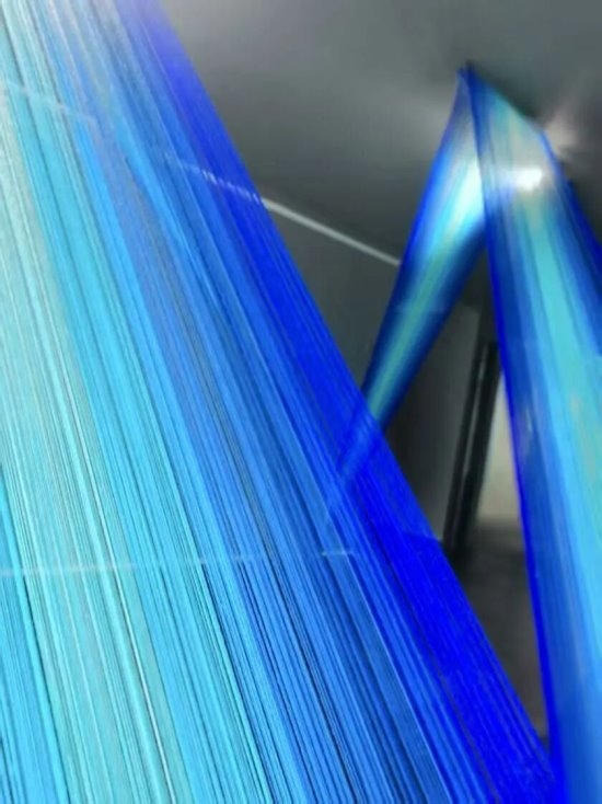 本次展览中的这件蓝色装置作品以线为核心媒介,将 “多姿多彩” 的特质演绎得淋漓尽致。无数束纯净的蓝色线条,如同瀑布般轻盈垂落,又似云朵般柔软舒展。不同深浅的蓝在空间中相互碰撞与叠加,不再以色彩的丰富取胜,而以层次与明暗的变化展现绒线材质的张力。